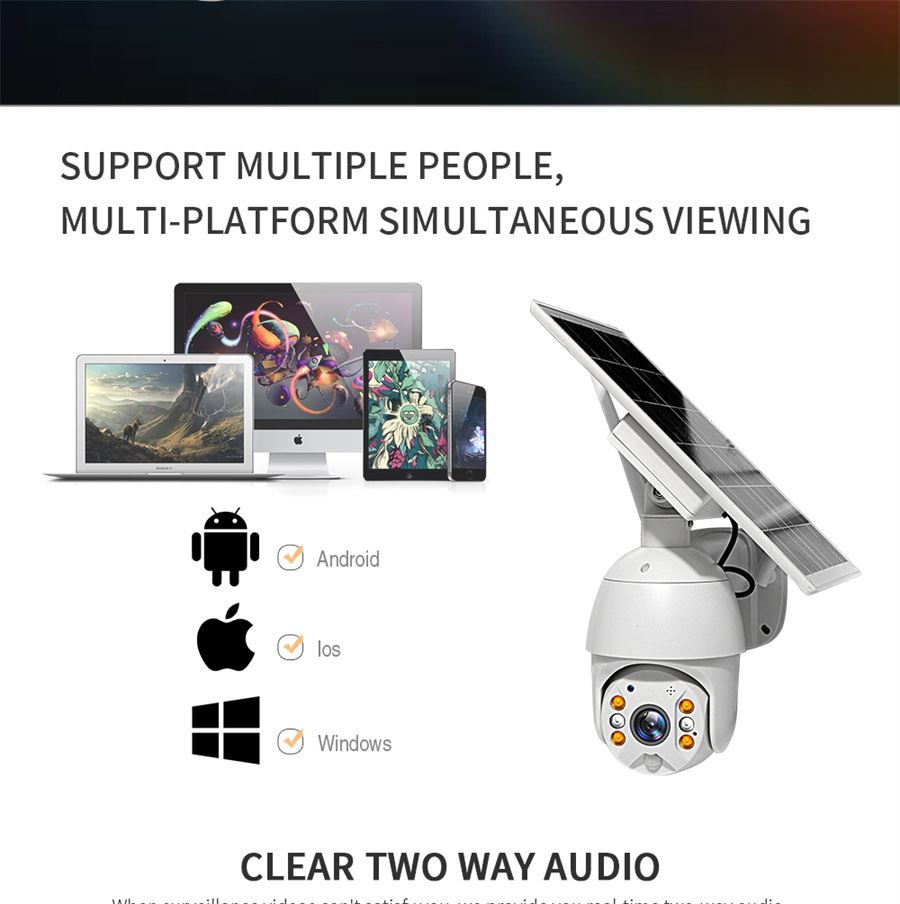 3. 1080P Full HD - Deze 2MP HD waterdichte PTZ-zonnecamera heeft 1920 * 1080P (2 Megapixel HD-lens) hoge resolutie, full HD-beeld voor dag en nacht, meer details op de foto. Ingebouwde CMOS-beeldsensor, geavanceerde algoritmen en chips verbeteren het gezichtsveld en dekken een groter bereik. U kunt genieten van een helderder zicht en video-opnames dan een 720P beveiligingscamera.